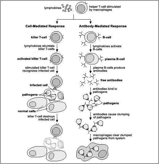 · Cellulare. Agisce soprattutto contro virus, miceti, cancro e patogeni intracellulari, e coopera con quella umorale preparando lorganismo allazione degli anticorpi. È detta anche citotossica, perché distrugge le cellule infettate.
